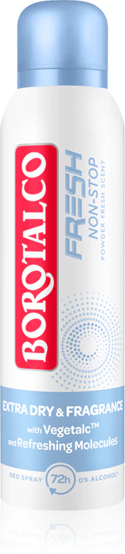 Simte prospețimea continuă cu Borotalco Fresco Non-Stop 72h, deodorant cu acțiune prelungită pentru o senzație curată întreaga zi. Formula sa cu talc vegetal și molecule răcoritoare reglează transpirația, oferind un efect uscat imediat și un parfum revigorant de curat. Asigură protecție intensă până la 72h, fără alcool. Ideal pentru zilele călduroase sau activități intense.