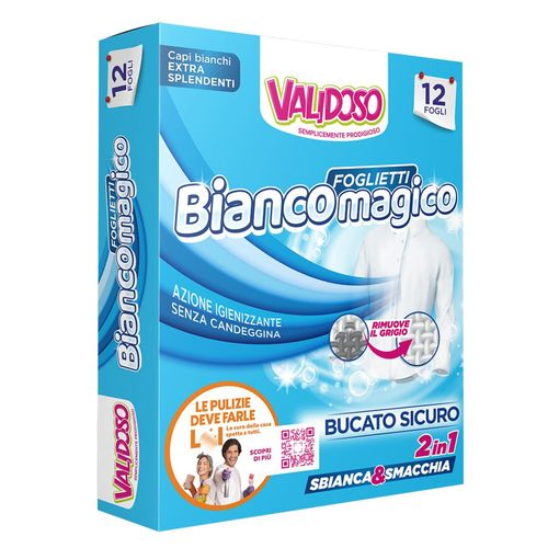 Validoso Bianco Magico este soluția ideală pentru menținerea hainelor albe ca noi. Foile se introduc în tamburul mașinii de spălat și acționează asupra murdăriei și îngălbenirii, fără a deteriora fibrele. Formula lor igienizează și oferă un efect de albire vizibil încă de la primele utilizări, fără a folosi clor sau substanțe agresive.Contine 12 buc