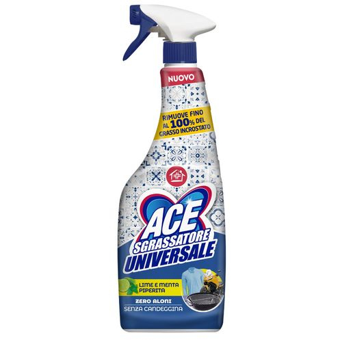ACE Sgrassatore Universale Lime & Menta Piperita este un detergent multifuncțional, ideal pentru curățarea bucătăriei, băii și a tuturor suprafețelor lavabile. Formula sa degresantă super-eficientă elimină rapid murdăria, grăsimea și petele persistente, lăsând un parfum revigorant de lime și mentă. Nu conține clor și nu lasă urme, fiind perfect pentru uz zilnic.